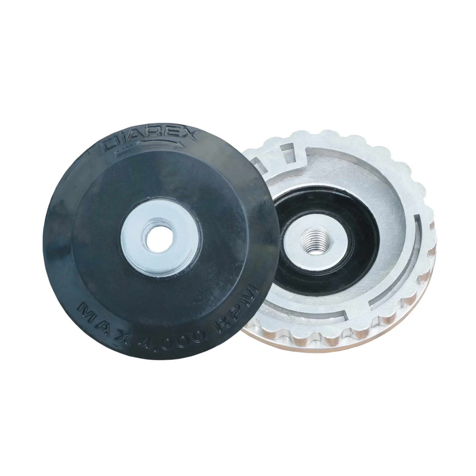 These aluminium backer plates are attached to the polishing tool, and each pad has a snail lock adapter. The adapter fits into place and locks on with a twisting motion. To remove the pads, untwist and remove, then replace it with the next grit.